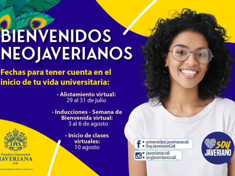 Ya falta poco para que nuestros nuevos estudiantes inicien su etapa académica en la Javeriana Cali. Para esto, la Universidad tiene preparada una serie de actividades para los neojaverianos que les brindará, de forma virtual, las capacitaciones del alistamiento y la inducción para luego dar inicio a las clases.